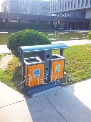 户外钢木分类垃圾桶,外形尺寸:1040/400/1000mm,整体板材采用实际厚度1.0镀锌钢板制作而成,两侧立柱为1.5厚镀锌钢管,外表做高温喷塑处理使其外表色泽鲜艳美观、防腐蚀能力更强等优点。木材采用进口樟子松经过防腐、打磨、喷漆处理,外表美观光滑,木材与桶体 链接全部使用马车栓使其牢固,永不脱落。