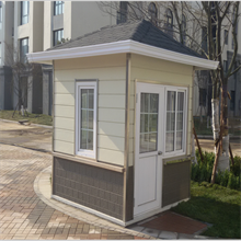 WJ-G001A型山东保安岗亭厂家潍坊保安岗亭为金属雕花板岗亭,根据三建要求把室内高度由原来的2.1米改为2.2米使室内空间更大,上顶采用尖顶结构这样既能防水又能和小区楼房协调,外墙为金属雕花板,内墙为高档PVC,吊顶为集成吊顶,所有门窗玻璃均采用中空玻璃提高岗亭整体的保温性能。是那边房檐为不锈钢,其中前面外出1米的加长房檐保证站岗保安不被风吹雨淋。